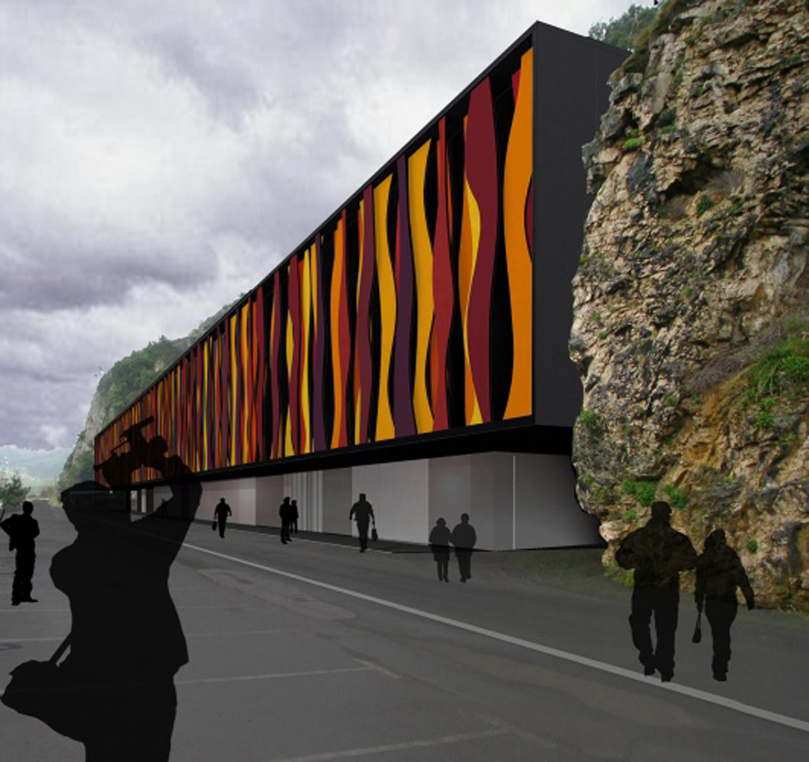 El edificio se ubica en la antigua cantera de Concurbión, que se encuentra en la margen izquierda del río Sella, a unos 250 m. de las cuevas de Tito Bustillo. El edifico es perfectamente visible desde Ribadesella. La cantera constituye el fondo visual del edificio, que se cuelga de ella como si fuese una viga que restituye la antigua masa rocosa y atiranta la montaña.